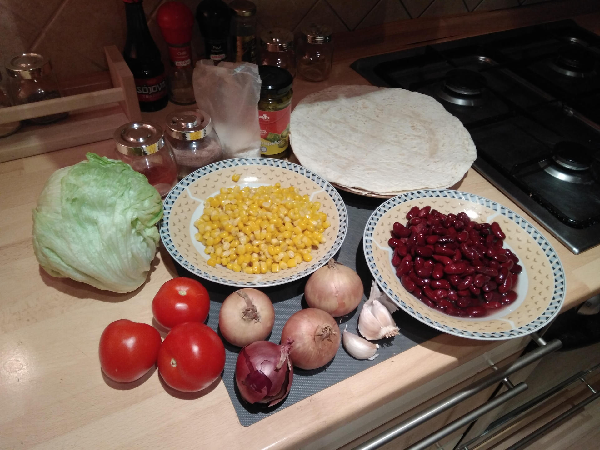 Na tortillu nejprve rozprostřeme natrhaný list ledového salátu. Doprostřed přidáme cca 4 lžíce směsi, připravené v předchozím kroku. Posypeme nakrájenými čerstvými rajčaty, červenou cibulí a jalapeňos papričkami. Můžeme přidat veganský sýr či veganskou smetanu.
